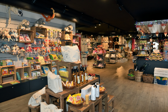 Im Zoo-Shop finden sich über 5.000 ansprechend präsentierte Artikel für Groß und Klein – seit neuestem ergänzt durch Plüschtiere, Sammelfiguren, Spiele und Bücher zur Dinoworld.