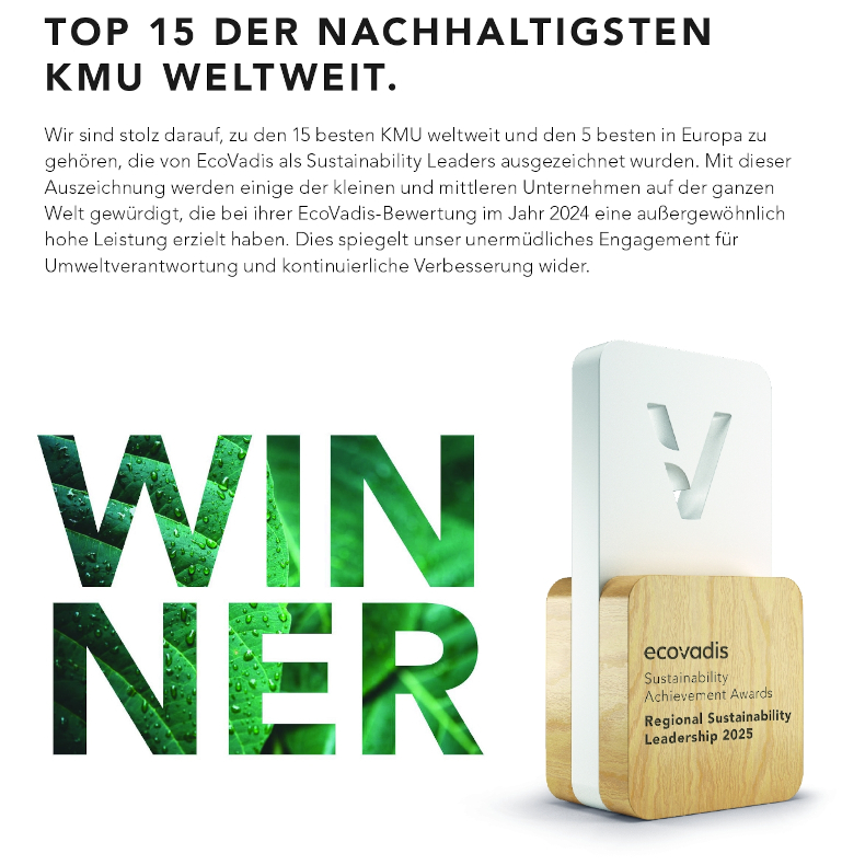 Wir sind stolz darauf, zu den 15 besten KMU weltweit und den 5 besten in Europa zu gehören, die von EcoVadis als Sustainability Leaders ausgezeichnet wurden. Mit dieser Auszeichnung werden einige der kleinen und mittleren Unternehmen auf der ganzen Welt gewürdigt, die bei ihrer EcoVadis-Bewertung im Jahr 2024 eine außergewöhnlich hohe Leistung erzielt haben. Dies spiegelt unser unermüdliches Engagement für Umweltverantwortung und kontinuierliche Verbesserung wider