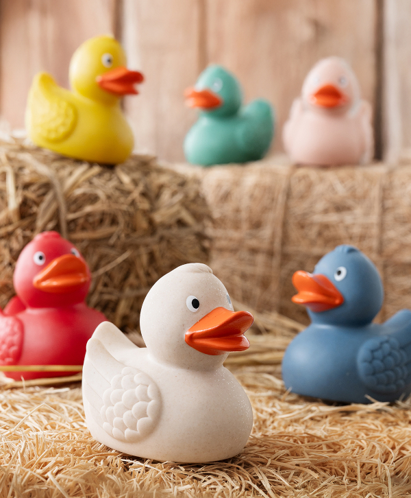 Die „Weizen-Enten“ interpretieren den Klassiker auf ressourcenschonende Weise neu. Der Materialmix aus Wheat-Mix-PVC mit hohem Weizenstrohanteil sorgt für eine matte Oberfläche, einen warmen Look und reduziert den PVC-Einsatz deutlich. Die Enten bieten gut sichtbare Flächen für Botschaften auf Brust oder Bürzel und verbinden modernes Design mit einem nachhaltigeren Ansatz.
