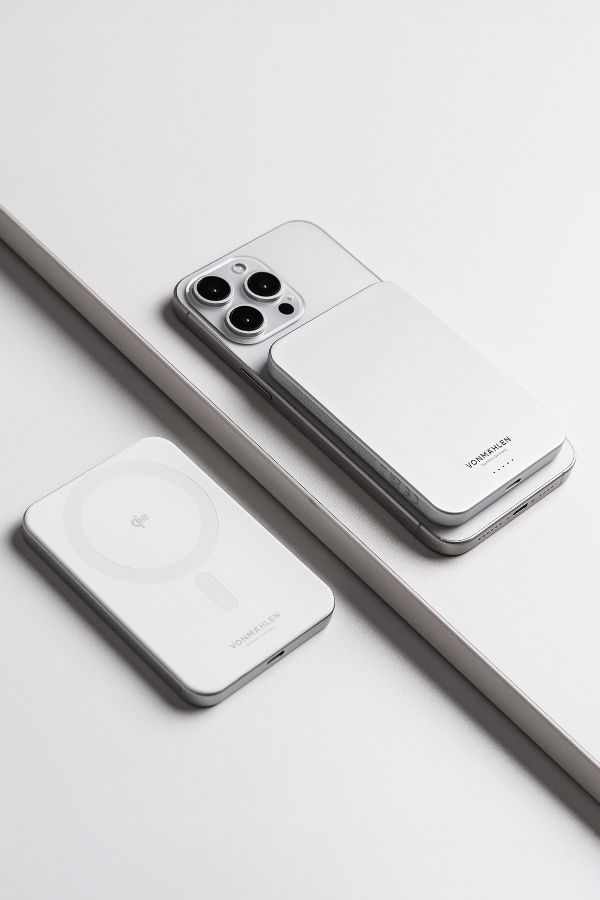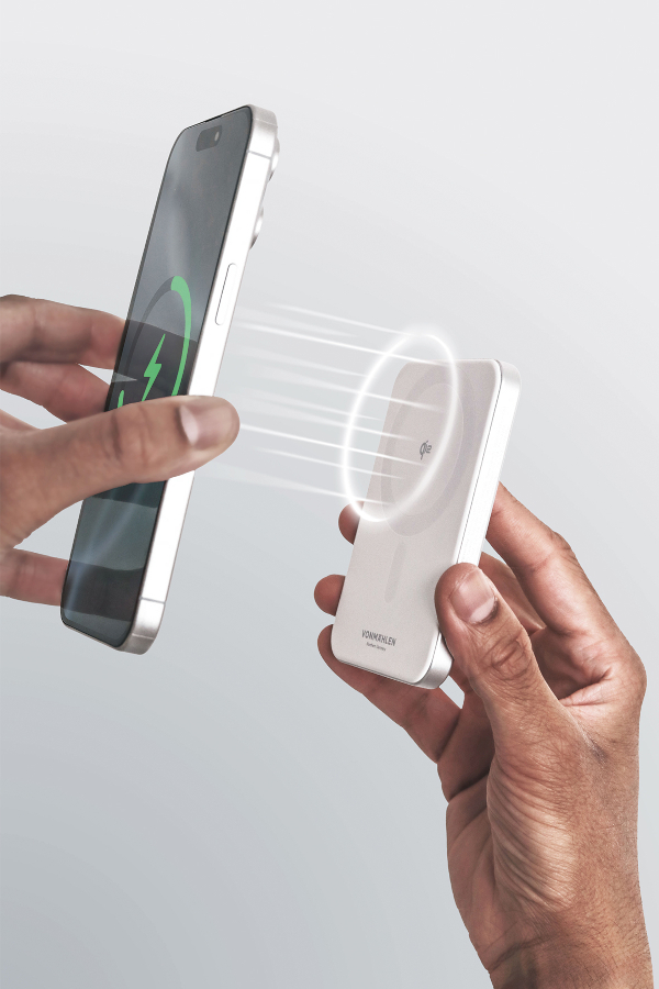 Stil, Sicherheit und Umweltbewusstsein vereint auch die Powerbank „Evergreen Mag“, kompatibel mit Apple MagSafe und allen Smartphones und Handyhüllen mit Magnetring bzw. Magnetic Power Profile. Mit ihrem ultraflachen Design, 5.000 mAh Kapazität und Qi2-zertifizierter Technologie ermöglicht sie schnelles, kabelloses Laden. Dabei setzt Vonmählen auf recycelte Materialien und eine besonders sichere Zellchemie, die höchste Qualitätsstandards erfüllt.