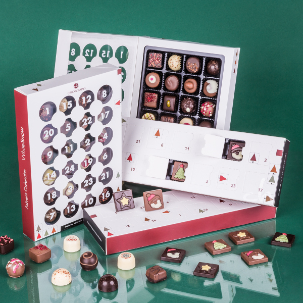 Ob für Kunden, Geschäftspartner oder Mitarbeitende – die edlen Kalender lassen sich ganz nach Wünschen gestalten, mit Logo, Aufkleber, Banderole oder komplett individuellem Design. Sogar eine individuell bedruckte Praline mit einem Wunschmotiv oder Logo ist möglich.