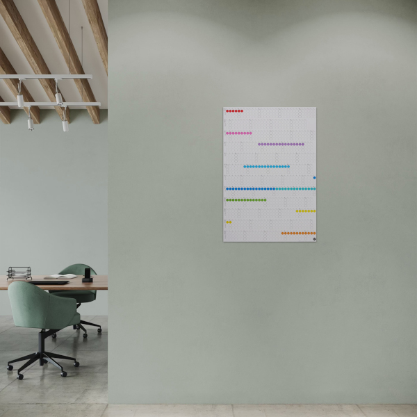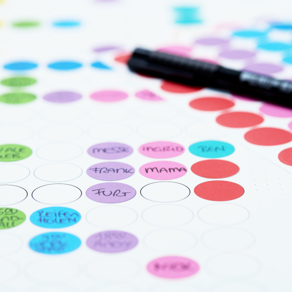 Das Herzstück von dot on sind die Klebepunkte, die für die verschiedenen Planer benutzt werden. Sie lassen sich beschriften und farblich unterschiedlichen Aufgaben und Terminen zuordnen. 14 Farbvarianten von knallig bunt bis minimalistisch sorgen je nach Geschmack oder Corporate Identity für Übersichtlichkeit. Veränderungen lassen sich darstellen, indem die Punkte abgehakt, überklebt oder neu platziert werden. Die Klebepunkte werden ressourcenschonend produziert, sind langlebig und wiederverwendbar.