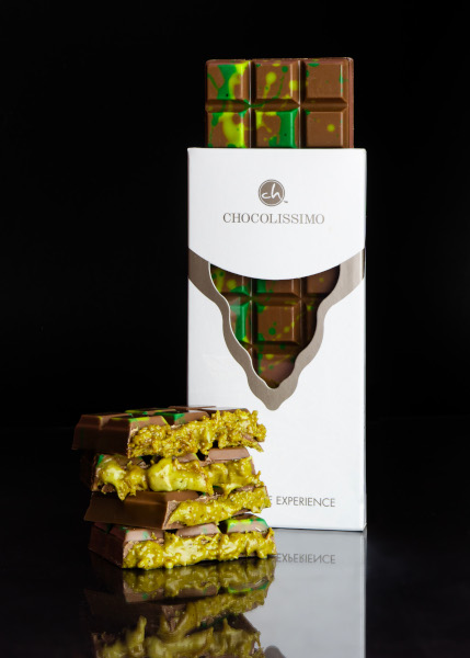 Die neueste Schokoladenkreation der Spezialisten für geschmackvolle Präsente entführt geschmacklich in den Orient. Feine belgische Schokolade trifft auf eine Füllung aus edlen Pistazien und zartem Kadayif-Teig. Veredelt mit handgemalten Details, wird jede Tafel zu einem kleinen Kunstwerk. Die Lieferzeit beträgt zwei bis drei Wochen ab Druckfreigabe und Bestellbestätigung.
