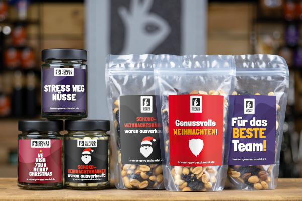 Besonders beliebt sind z.B. das hausgemachte Studentenfutter, Gewürzmischungen und zartschmelzende Schokoladen – alles mit einer großen Auswahl an festlich gestalteten Etiketten. Auf Wunsch lassen sich die Etiketten auch komplett individuell gestalten, passend zum Corporate Design oder Anlass. Ein Teil jedes Verkaufs unterstützt über die Genusshelfer-Initiative gezielt soziale Projekte.