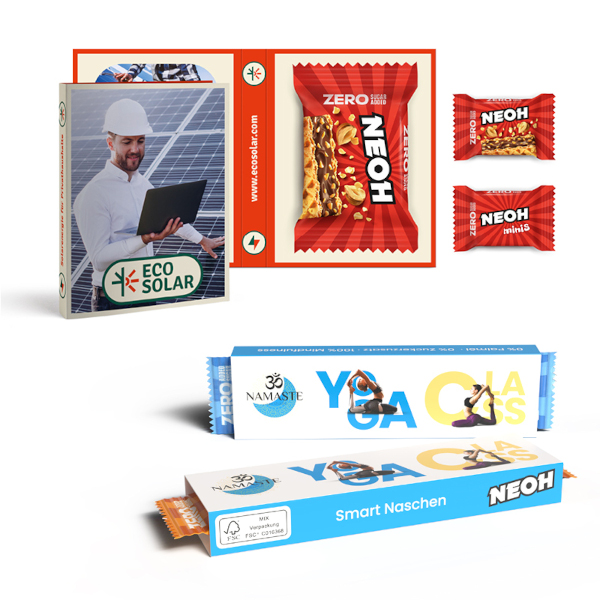 Alle Neoh-Riegel sind frei von Palmöl und werden in einem individuellen Werbeschuber aus FSC-zertifiziertem Papier angeboten.