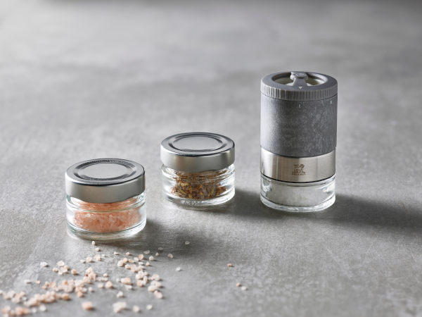 Ein weiterer Vorteil der „Maestro Salzbar“ ist das praktische Schraubsystem, mit dem sich die Salzgläser unter der Mühle im Handumdrehen austauschen lassen um zwischen naturbelassenen oder aromatischen Salzen zu wechseln.