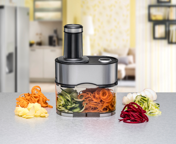 Die fünf verschiedenen Messereinsätze schneiden z.B. „Gemüsenudeln“, die wie unterschiedliche Pasta-Sorten geformt sind. Feine Rettich-Spiralen für eine bayerische Brotzeit sind zudem ebenso schnell hergestellt wie Kartoffel-Spiralen zum Frittieren.