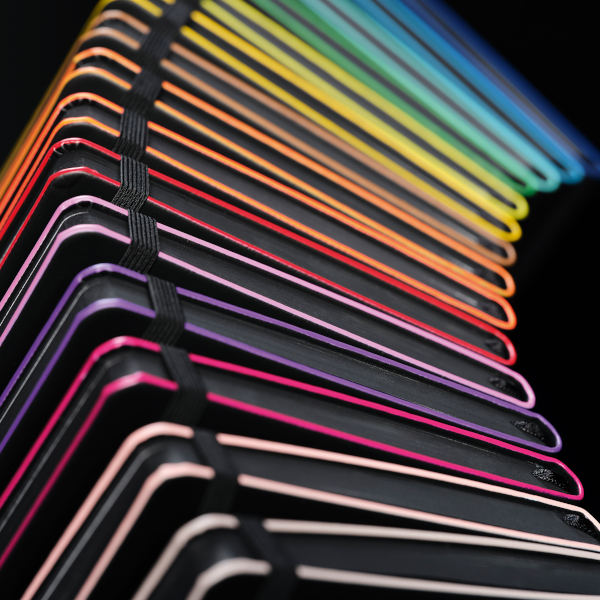 Die Notizbuchserie „Black Laser“ fällt mit ihrem schwarzen Einband, dem schwarzen Farbschnitt und der leuchtend farbigen Kantengestaltung auf. 192 nummerierte Seiten inkl. Inhaltsverzeichnis können beschrieben werden. Vier verschiedene Inhalte und sieben Farbgestaltungen sorgen für eine große Auswahl.