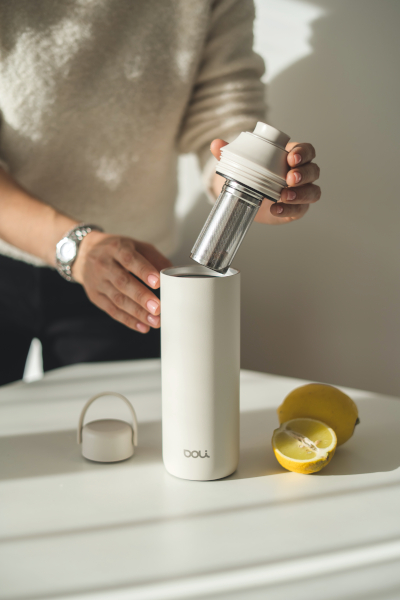…und aus einer hübschen Trinkflasche schmecken Heißgetränke besonders gut. Das 2016 gegründete Unternehmen Doli bietet schadstofffreie, hochwertige und nachhaltige Trinkflaschen, wie die Doli-Teeflasche „Thermo“. Hierbei handelt es sich um eine 3-in-1-Flasche aus doppelwandigem Edelstahl, die bis zu 600ml Flüssigkeit fasst.