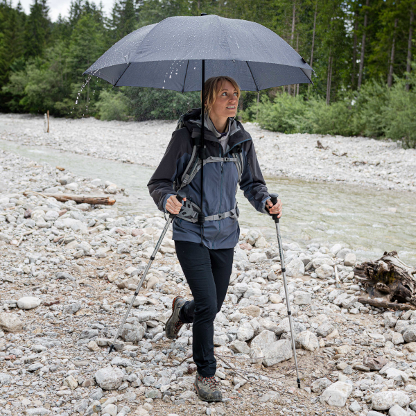 Neben Funktionalität und Komfort überzeugt der Trekkingschirm auch durch seine umweltfreundliche Herstellung, da er ohne PFAS gefertigt wird. Die Farbvariante Schwarz unterstreicht das reduzierte, funktionale Design.