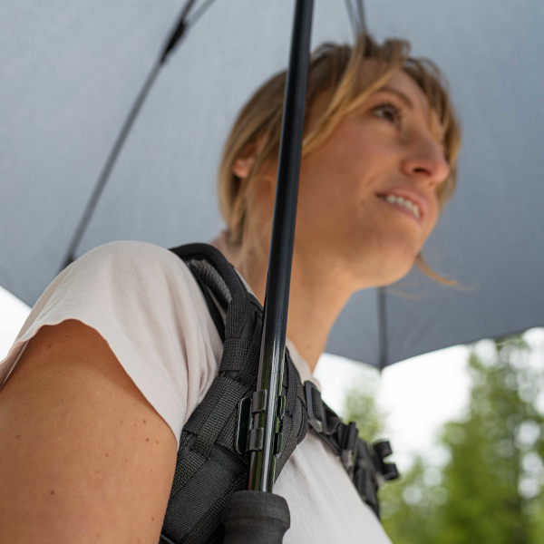 Der handfreie Trekkingschirm von Eberhard Göbel überzeugt als ultraleichte Variante für Outdoor-Aktivitäten und bietet gleichzeitig höchstmöglichen UV-Schutz mit UPF 50+. Der Schirm lässt sich an jedem handelsüblichen Rucksack mit Hüftgurt befestigen und je nach Wind- und Regenrichtung flexibel ausrichten. Alternativ kann er auch mit einem speziellen Tragegurt-System von EuroSchirm genutzt werden.