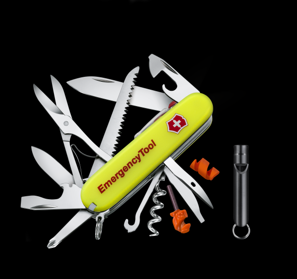 Das „Emergency Tool Huntsman Lite“ verfügt über 23 Funktionen, mit denen man im Notfall bestens vorbereitet ist – darunter ein praktisches LED-Licht oder eine Trillerpfeife. Dank des integrierten Feuerstahls und Zunder lässt sich mit dem Multitool auch ohne Gas oder Strom Feuer entfachen und so für Wärme sorgen. Das Multitool wird in der Schweiz hergestellt und ist via Ätzung auf Klinge. Tampondruck oder Gravur auf der Schale veredelbar.